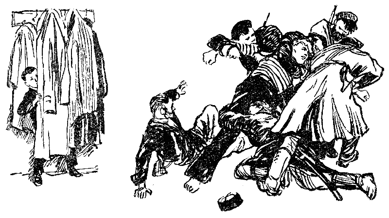 Миша забился в кучу висевшего на вешалке платья. Сердце его колотилось. Сейчас произойдет то, что виделось Мише в захлестывавших его мечтах: Полевой встанет, двинет плечами и один разбросает всех.