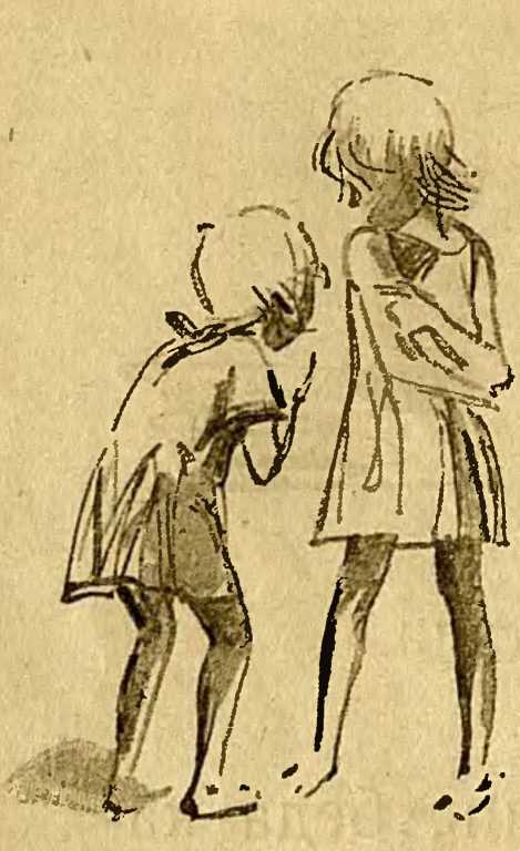 Паня насыпает в утюг еще угля и ставит утюг на кирпич у водосточной трубы, чтобы уголь скорей разгорелся. Огонь так и рвется в трубу, даже слышно, как. ветер через утюг гудит. Паня стоит, утюга дожидается, а Нюшка уже тут как тут.