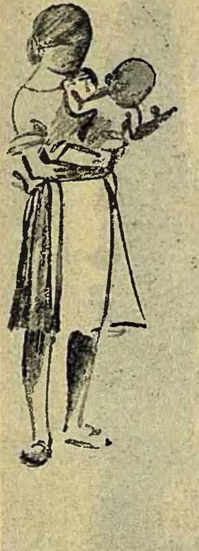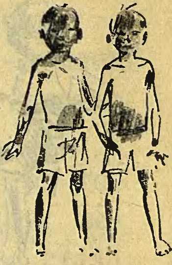 Нюша с Муркой часто приходят к Пане и возятся с Левкой. На руках у Левки ниточки — перетяжки. Нюше смешно: все у него как у настоящих людей — руки, ноги, пупок, уши, нос. Ну, нос еще не настоящий, а глаза — те совсем настоящие, только очень синие.