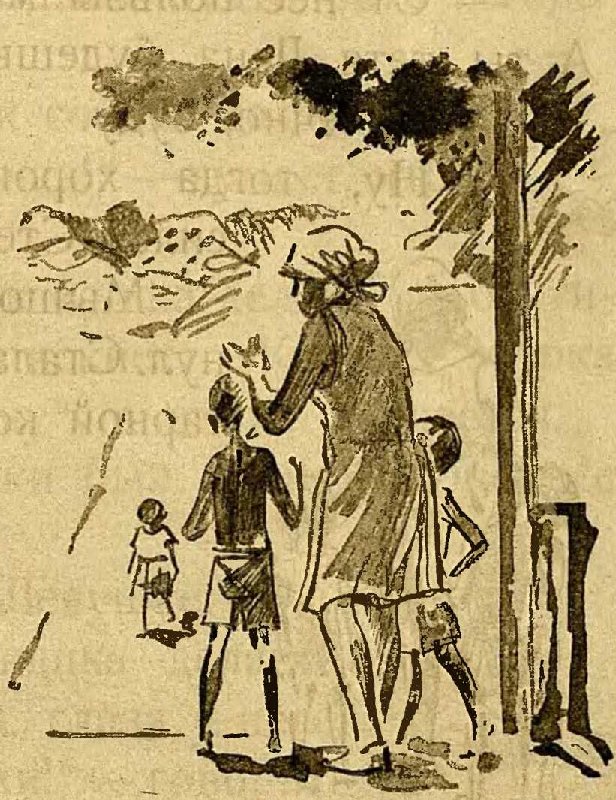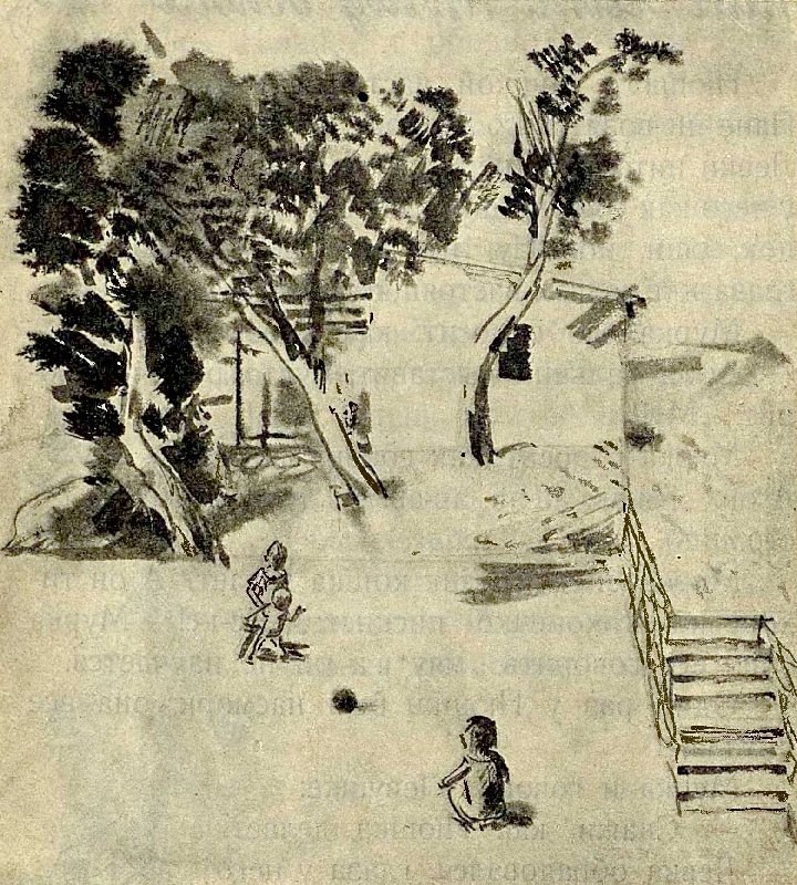 Тетя Лена и Мишка сидели в тени, — у них за спиной листья были темные.
