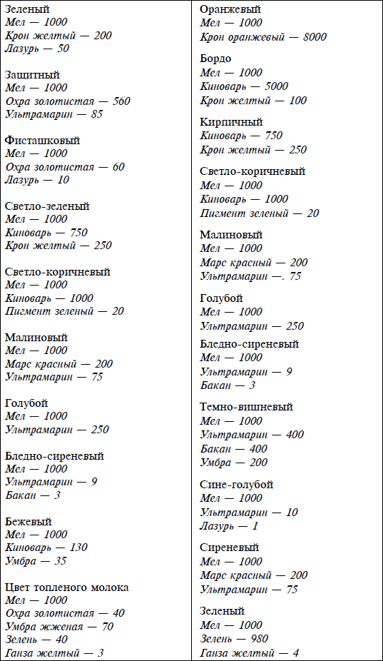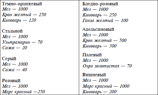 В табл. 5 приведены цветные колеры, изготовляемые из различных пигментов. Материалы указаны в граммах, клей и вода берутся по потребности.