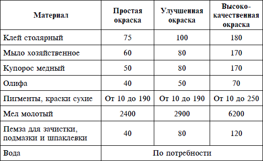Из приведенных таблиц видно, что количество материалов, применяемых для тех или иных целей, бывает разным. В основном это зависит от качества выполнения окраски, вида поверхности (гладкая, шероховатая и т. д.), ее тянущей способности и др.