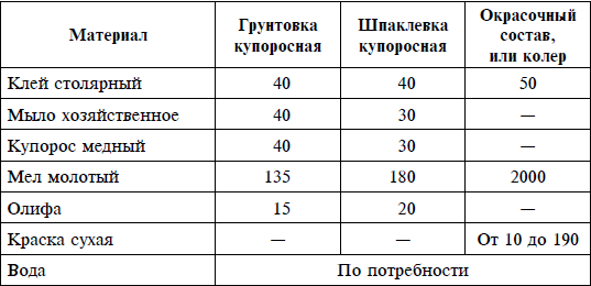 При применении готовых огрунтовочных или окрасочных составов на 1 м 2поверхности требуется: колера – 0,2 л, купоросной грунтовки – 0,2 л, шпаклевки для первого раза – 0,4 л, для второго раза – 0,2 л.