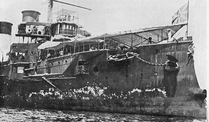 THE DAMAGED FORECASTLE (STARBOARD) OF CRUISER OLEG