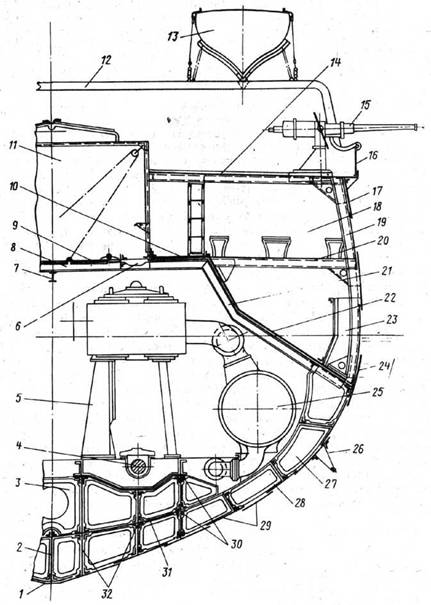 1 — двойная наружная обшивка днища; 2 — вертикальный киль; 3 — лист машинного фундамента; 4 — коленчатый вал; 5 — главная паровая машина; 6 — броневой колосник (вентиляционные жалюзи); 7 — карленгс; 8 — бимс горизонтального участка броневой палубы; 9 — броневая крышка (с приводом подъема талями); 10 — двухслойная броневая палуба (горизонтальный участок); 77 — легкий кожух машинного отделения; 72 — ростерный бимс; 13 — паровой катер на рострах; 14 — бимс верхней палубы со стальным и деревянным настилами; 15 — 75-мм орудие на верхней палубе; 16 — фальшборт с вырезом для орудия; 77 — ширстрек (с дополнительным накладным листом); 18 — баня команды; 19 — шпангоут; 20 — бимс промежуточной палубы и ее стальной настил; 21 — бимс гласиса; 22 — скос броневой палубы (из двух слоев); 23 — бортовой коффердам; 24 — накладной лист усиления узла притыкания броневой палубы к борту; 25 — главный холодильник; 26 — скуловый киль; 27 — бракета водонепроницаемого флора; 28 — заварная рамка (обделочный угольник по периметру водонепроницаемого флора); 29 — листы обшивки (соединение по пазам — внакрой без фланжировки с установкой полос на толщину „верхнего" листа по набору); 30 — продольный обделочный угольник крепления стрингеров и балок машинного фундамента; 31 — настил внутреннего дна; 32 — основные и дополнительные днищевые стрингера под машинным фундаментом.