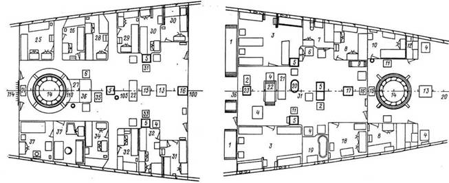 1 — рундук для больших чемоданов; 2 — люк ручной подачи 75-мм патронов; 3 — лазарет; 4 — люк в кладовую запасов; 5 — шахта элеватора подачи 152-мм боеприпасов; 6 — люк в винный погреб; 7 — каюта фельдшера; 8 — каюта кондуктора; 9 — рундук для малых чемоданов; 10 — каюта боцмана; 11 — люк схода и ручной подачи 152-мм патронов; 12 — каюта унтер-офицера; 13 — люк в помещение динамомашин; 14 — подачная труба башни 152-мм орудий; 15 — люк в карцер; 16 — люк схода и ручной подачи мелких патронов;' 17 — шахта элеваторов подачи 47-мм патронов; 18 — аптека; 19 — ванная и санузел; 20 — броневая труба защиты кабелей и приводов из боевой рубки; 21 — люк для передачи раненых; 22 — трап на верхнюю палубу; 23 — шахта элеватора подачи 75-мм патронов; 24 — люк в подбашенное отделение; 25 — каюта трюмного механика; 26 — каюта минного механика; 27 — фотолаборатория; 28 — каюта младшего артиллерийского офицера; 29 — каюта младшего врача; 30 — спальня и- кабинет старшего механика; 31 — кагота священника; 32 — каюта офицера; 33 — люк в погреб 152-мм боеприпасов; 34 — каюта младшего минера; 35 — люк в погреб 75-мм патронов; 36 — помещение хронометров; 37 — кабинет и спальня старшего офицера.