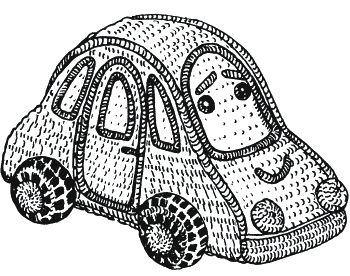 Приступить к сборке игрушки. Соединить короткие стороны центральной детали машины с помощью столбиков без накида. На боковые части машинки пришить «стекла», вышить черными ниткам контуры дверей, ручки, «дворники» на лобовом стекле, при желании на нем можно вышить глаза и улыбающийся рот.