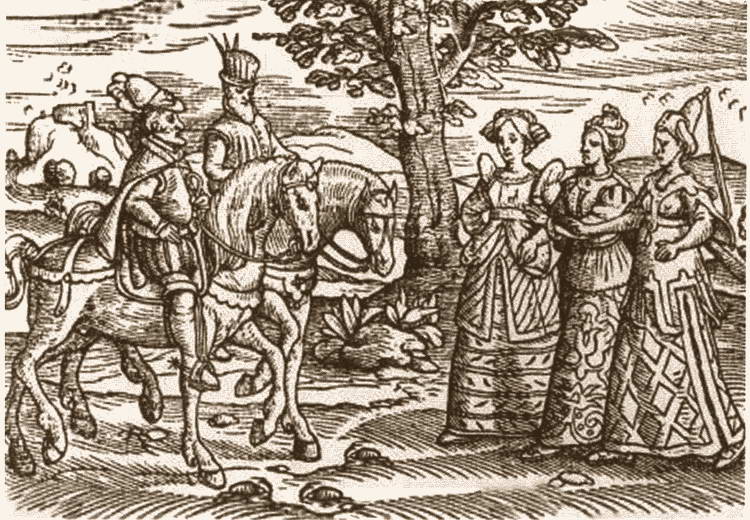 Ведьмы предсказывают будущее Макбету. Миниатюра из «Хроник» Холиншеда