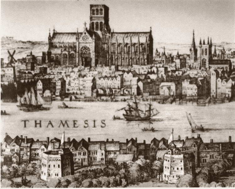 Вид Бэнксайда, района на правом берегу Темзы. На переднем плане театр «Глобус» (справа) и арена для медвежьей травли (слева)