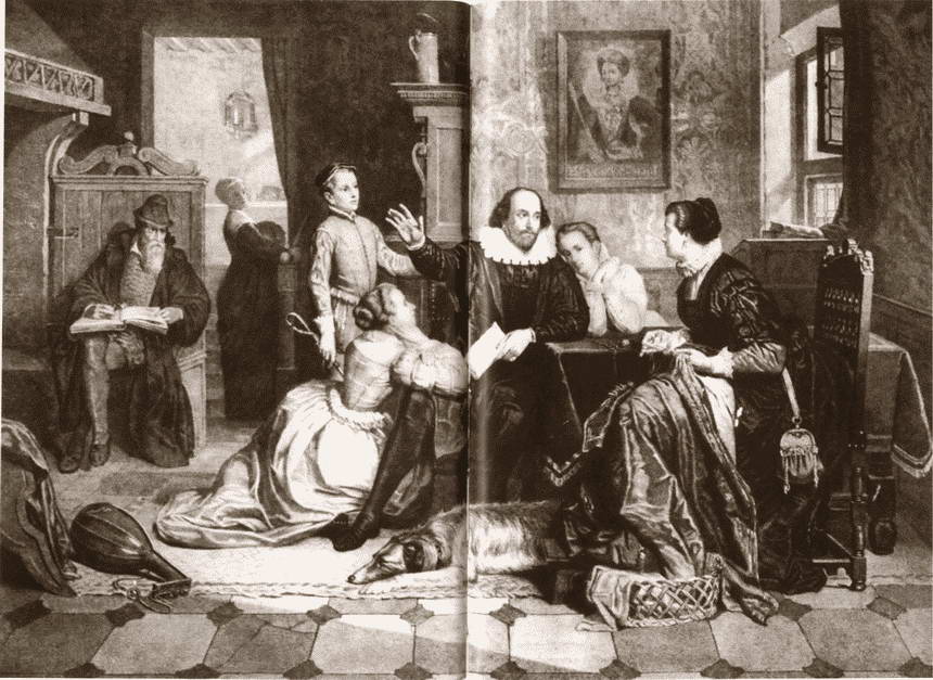 Шекспир читает своему семейству «Гамлета». Гравюра XIX в.