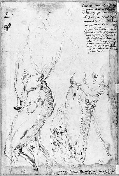 Так вот, из книги мы узнали, что в Королевской библиотеке города Турина, оказывается, хранится рисунок, выполненный Бенвенуто Челлини собственноручно. (См. главу «Турин. Библиотека Реале».) На одной стороне листа бумаги — наброски фрагментов статуй и текст, написанный рукой Челлини. А на другой стороне этого же листа — портрет человека с каким-то мятежным выражением лица, который Ирина показала мне в магазине.