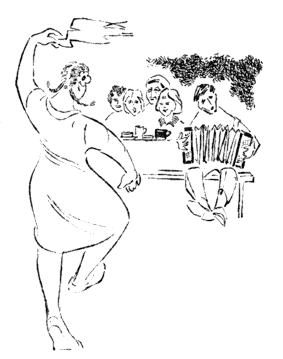 Девочки, такая мода — Поясочки лаковы. Девочки, не зазнавайтесь, Все вы одинаковы.И так это началось. Ольга и Тася вспотели, с гармониста тоже пот лился градом, но никто не останавливался, и все они были с серьезными лицами, и это длилось бесконечно долго.