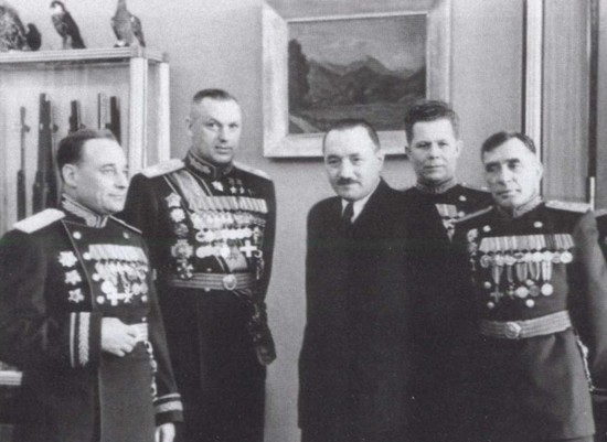 Начало мирной жизни. Маршалы Говоров, Рокоссовский, Конев и Мерецков с народным артистом СССР Р. Н. Симоновым