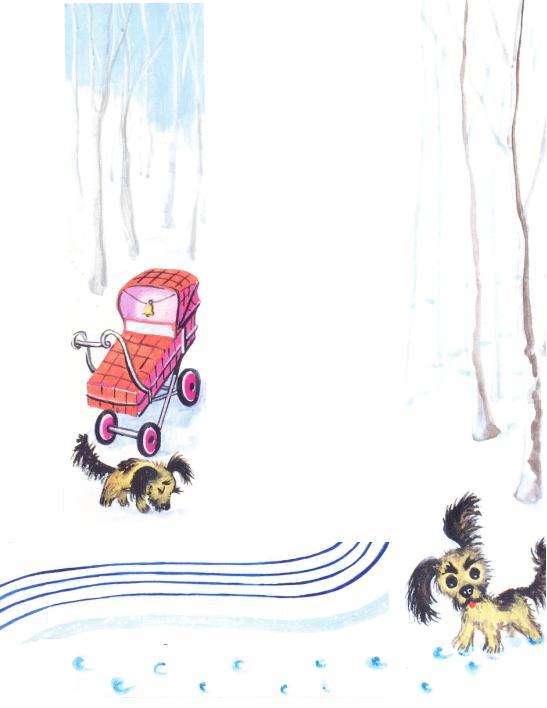 Молодой папаша то качал коляску, то хватался за погремушку — ничего не помогало. Он задумался. Что же все-таки с малышом? — и не заметил, что на снегу, рядом с коляской, появились странные маленькие ямки, а привязанный к ней колокольчик прозвенел сам собой.