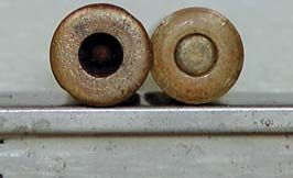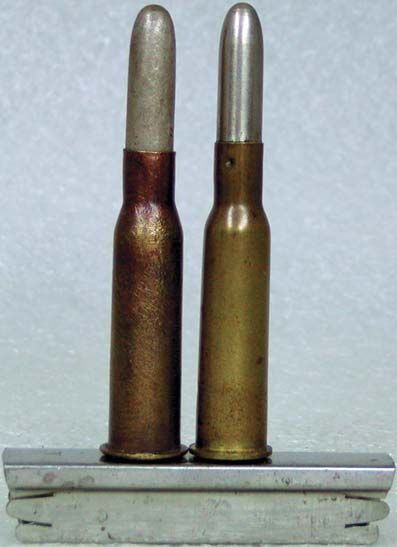 Слева – один из прототипов трёхлинейного патрона, калибр 8 мм, пуля в мельхиоровой оболочке. Справа – принятый на вооружение штатный патрон для винтовки обр. 1891 г.