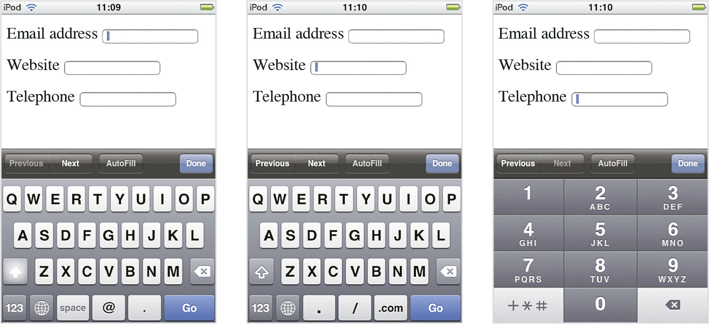 Рис. 4.05. Mobile Safari показывает разные экранные клавиатуры в зависимости от значения атрибута type