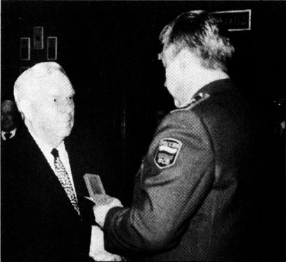 Директор Федеральной службы безопасности Н.Д.Ковалев вручает Почетный знак бывшему председателю КГБ. 1997