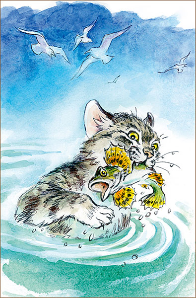 Кошка лапами нащупывала на дне мелкую рыбёшку, что уходила из невода. Эти рыбки прячутся на дно, закапываются в песок — вот тут-то их и ловила Мурка. Нащупает лапкой, подцепит когтями и бросает на берег своим детям. А они уж совсем большие коты были, а боялись и ступить на мокрое. Мурка им приносила на сухой песок живую рыбу, и тогда они жрали и зло урчали. Подумаешь, какие охотники!