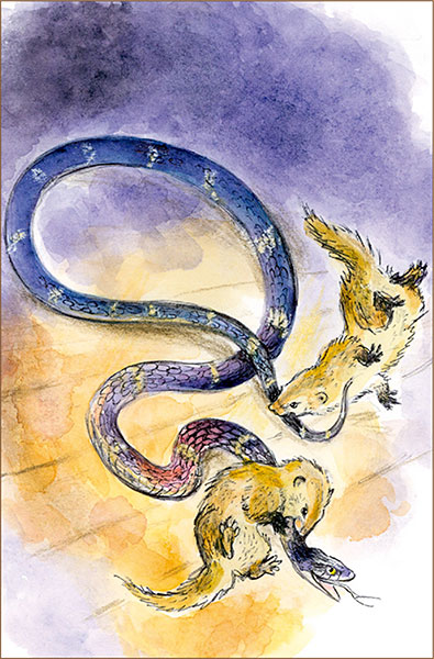 Но дикая упиралась всеми лапками и вытаскивала змею всё больше и больше. Змея была толщиной в два пальца, и она била хвостом о палубу, как плетью, а на конце держалась мангуста, и её бросало из стороны в сторону. Я хотел обрубить этот хвост, но Фёдор куда-то скрылся вместе с топором. Его звали, но он не откликался. Все в страхе ждали, когда появится змеиная голова. Сейчас уже конец, и вырвется наружу вся змея. Это что? Это не змеиная голова — это мангуста! Вот и ручная прыгнула на палубу: она впилась в шею змеи сбоку. Змея извивалась, рвалась, она стучала мангустами по палубе, а они держались, как пиявки.