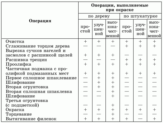 Отделочниками выполняется простая, улучшенная и высококачественная окраска. В зависимости от чистоты отделки мастеру потребуется то или иное количество времени и средств. Например, при простой окраске масляными красками по дереву нужно будет проделать 6 операций, а при улучшенной – 9 (см. табл. 3).