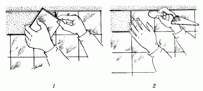 Второй способ – укладка плиток наклонными рядами. В этом случае прямолинейность стыков между плитками кладки следует контролировать по причальному шнуру, установленному под углом 45° к горизонтали. Как и второй ряд, предпоследний также будет состоять из треугольников, а верхний (последний) – представлять собой прямой ряд из квадратных плиток. Качество облицовки проверяется с помощью 2-метровой рейки, а зазор, обнаружившийся между облицовкой и плоскостью рейки, устраняется так же, как описано выше.