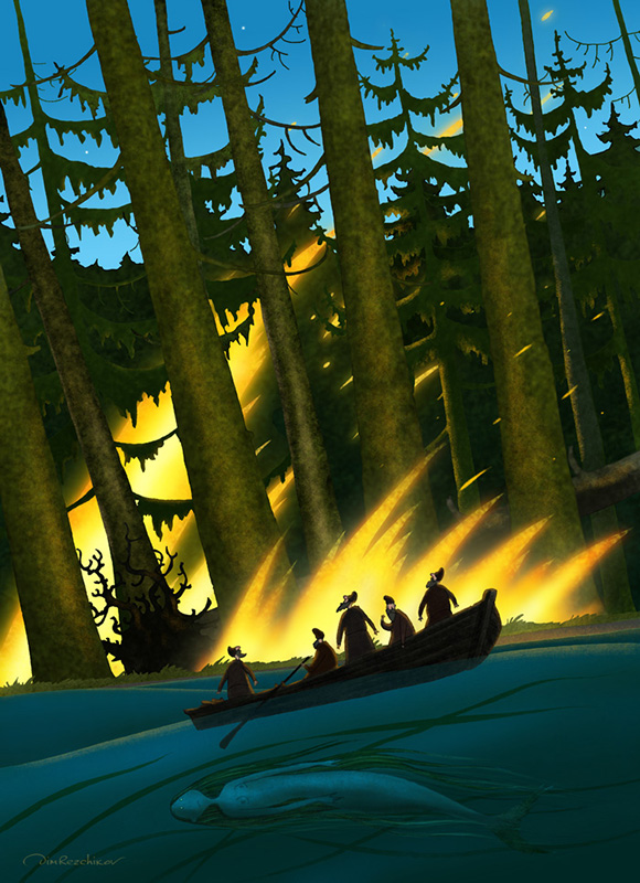 Степан им говорит: «Что же вы, испугались? Давайте лес сейчас подпалим, пока дождей нет, а то в другой раз ехать неохота. А валить лес не будем, сам сгорит — вон вокруг сколько сухостоя! По весне пни повыкорчуем, землю распашем и зерно засеем». Так и порешили — разложили в нескольких местах солому, что с собой привезли, ветки, сухой осоки подбросили, смолой полили и подожгли, и отчалили побыстрей, как только огонь принялся.