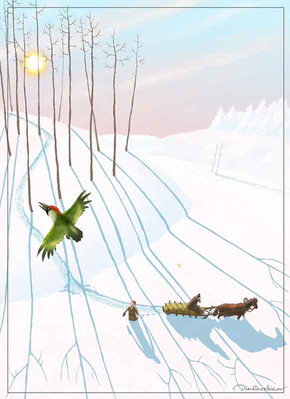 Дали Афоне лучшего коня, шубу теплую, деньги в узел завязали, — и отправили. С утра вроде солнце светило, а только за ворота выехали — ветер поднялся. Сперва легонько так дуло, по земле мело. Афоня говорит Егорке: «Через лес поедем, так прямее». Да как по лесу версты четыре отъехали, такая метель поднялась! Снегом в глаза лепит, путь заметает. Еле едут: лошадь в снегу спотыкается, руки не слушается, чуть что назад к деревне поворачивает. Егорка спрыгнул с саней и впереди лошади пошел, тянет ее за уздцы, а Афоня с саней понукает. Два раза чуть не перевернулись. Наконец завязли совсем. Афоня кричит Егорке: «Поворачивай назад, в деревне переждем!» Повернуть-то повернули, а пути назад не видно. Только вот сани тут ехали, а уже все снегом по пояс замело. Егорка путь ищет, по снегу бегает, да где там! В такие буераки заехали, чуть полоз не сломали. Афоня не на шутку испугался: неужто в лесу ночевать придется? А как волки снова появятся? Нет, ехать надо.