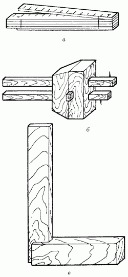 Используют для установления точного прямого угла и для измерения угла между сторонами деталей. Он чаще всего состоит из металлических или деревянных частей, реже делается полностью стальным. На одной из сторон имеется разметка в 1 мм для удобства в работе (рис. 12, в).