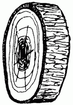 На свежем спиле растущего дерева слой камбия представлен очень хорошо. После того как снята кора, открывается тонкая прослойка влажной ткани зеленоватого цвета – это и есть камбий. За камбием расположена собственно древесина с годичными кольцами. Древесину еще называют заболонью. В центре каждого дерева есть ядро, которое по цвету может сливаться с заболонью или иметь более темный цвет. В зависимости от этого разделяют заболонные породы древесины, где ядро не имеет ярко выраженной структуры и клетки расположены так же плотно, как и в заболони (рис. 4), и ядровые, где, соответственно, ядро хорошо различимо (рис. 5). Иногда заболонные породы дерева называют безъядровыми.