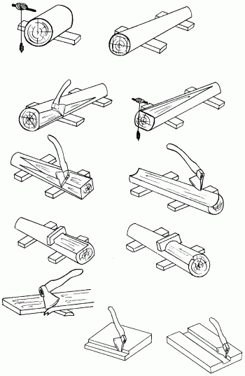 Используется только при обработке кряжей, пластин и четвертей. Основной инструмент работы – топор. Прежде чем приступать к тесанию бревна, его освобождают от коры, укладывают на подмостки и шнуром намечают линии тески. С той стороны бревна, которая подлежит обработке, делают надрубы на расстоянии 400–500 мм на глубину отесываемой части бревна. После этого начинают скалывать щепу и протесывать бревно, строго придерживаясь линий разметки (рис. 40).