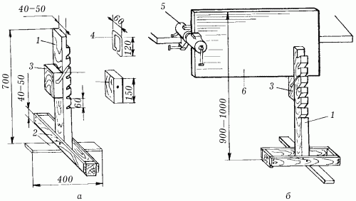 Чтобы изготовить такую подставку, потребуются: брусок для стойки и ползуна, дощечки для крестовины, кусок проволоки диаметром 3–4 мм для скобы, гвозди для сколачивания крестовины и крепления к ней стойки. Опорные заплечики и зазубрины на стойке выпиливают ножовкой. Проволочную скобу сгибают в тисках и с двух сторон вставляют в отверстия, пробитые в ползуне гвоздем. Закрепление обрабатываемой плиты показано на рис. 46, б: одну ее сторону зажимают в тисках, а другую опирают на ползун, установленный на требуемой высоте, которую определяют удобным для строгания возвышением обрабатываемой кромки над уровнем пола. Обычно она составляет 900–1000 мм.