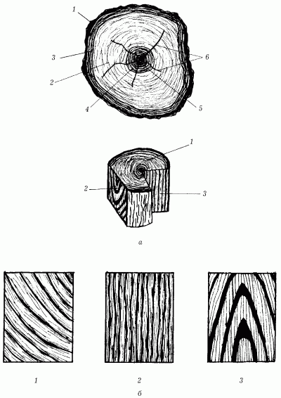 Рис. 6. Составные части поперечного распила ствола и текстура древесины на трех разрезах: а – составные части поперечного распила ствола: 1 – лубяной слой коры; 2 – камбий; 3 – заболонь; 4 – ядро; 5 – сердцевина; 6 – сердцевидные лучи; б – текстура древесины сосны на трех разрезах: 1 – на поперечном; 2 – на радиальном; 3 – на тангентальном.