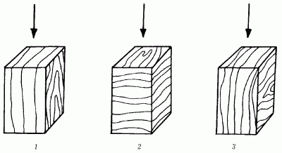 Рис. 7. Испытание прочности древесины по направлению нагрузки: 1 – вдоль волокон; 2 – поперек волокон радиально; 3 – поперек волокон тангентально.