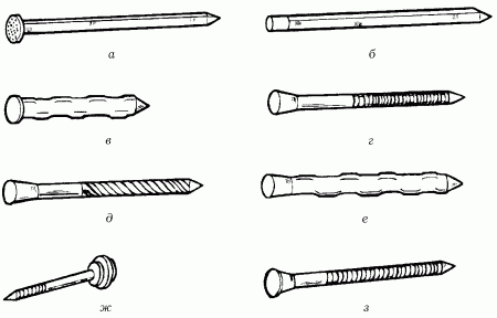 Рис. 67. Разновидности гвоздей: а – гвоздь прямой, гладкий, круглый или четырехгранный, с простой или оцинкованной поверхностью, для плотничных и строительных работ; б – гвоздь дюкерный, не имеющий шляпки, четырехгранный; в – гвоздь кровельный, круглый, профилированный, для работ с картоном, толем и другими листовыми материалами; г – гвоздь ребристый, круглый, с рифленой оцинкованной поверхностью для выполнения соединений, имеющих большую нагрузку на растяжение; д – гвоздь крученый с обычной или потайной головкой, применяется для мест с изменяющейся нагрузкой, например для закрепления досок пола; е – гвоздь с ребристой профилированной поверхностью; ж – гвоздь круглый, с ребристой поверхностью, с увеличенной шляпкой в виде шайбы, применяется при кровельных работах; з – гвоздь анкерный, круглый, с оцинкованной ребристой поверхностью.