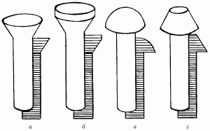 Рис. 68. Виды заклепок: а – заклепка с потайной головкой; б – с полупотайной головкой; в – с полукруглой головкой; г – с конической головкой.