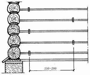 На этот окладной венец уже накладывают бревна, которые и образуют стену. Для того чтобы венцы крепко лежали друг на друге, в нижней части каждого бревна делают полукруглый паз. При укладке бревен каждый венец прокладывают слоем мха или просмоленной пакли, который закрывает все щели между венцами и служит хорошей теплоизоляцией. Для дополнительного крепления бревен на расстоянии 15–20 см в шахматном порядке устанавливают нагели (рис. 70).