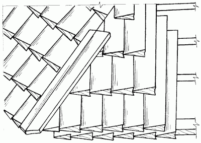 Гонтовая кровля принадлежит к числу наиболее дорогостоящих и отличается сложностью монтажа. Однако материальные затраты стоят того: кровля, отделанная гонтом, является самой прочной из всех вышеперечисленных и имеет большой срок эксплуатации. К тому же ее необычная конструкция (рис. 89) может служить в качестве дополнительного декоративного элемента, украшающего здание.