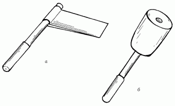Рис. 90. Приспособления для изготовления гонта в домашних условиях: а – колющее лезвие; б – колотушка.