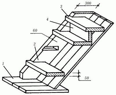 Рис. 91. Конструкция внутренней лестницы с врезными ступенями: 1 – доска пола; 2 – тетива; 3 – проступь; 4 – подступень.