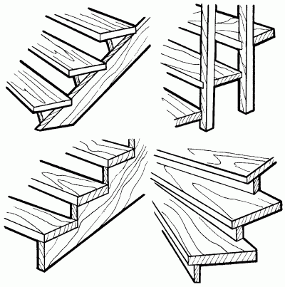 Рис. 92. Варианты крепления проступей и подступеней к косоурам.