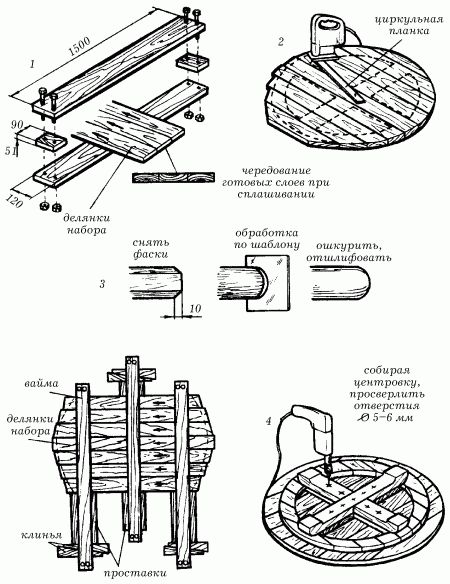 Рис. 99. Изготовление стола из массива древесины: 1 – набор заготовки столешницы; 2– выпиливание круговой заготовки; 3 – строгание кромок столешницы; 4 – высверливание отверстий под ножки.