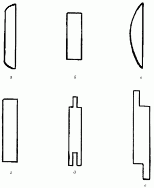 Рис. 8. Виды досок (поперечные срезы): а – необрезная доска; б – обрезная доска; в – горбыль; г – доска, строганная с четырех сторон; д – шпунтованная доска (с пазом и гребнем); е – фальцованная доска.