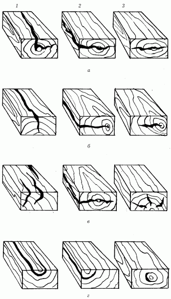 Рис. 11. Типы трещин в древесине: 1 – пластевые; 2 – кромочные; 3 – торцевые; а – метиковые; б – морозные; в – трещины-усушки; г – отлупные.