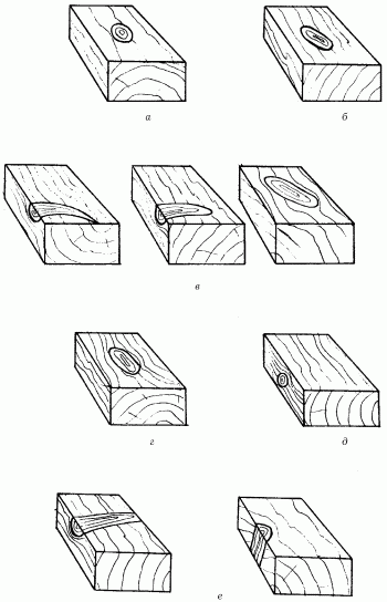 Рис. 10. Разновидности сучков: а – круглый; б – овальный; в – продолговатые; г – пластевой; д – кромочный; е – сшивной.