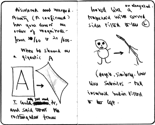 Я увидел в центре поля зрения огромную черную пустоту, контур ее напоминал амебу с ложноножками. Чернота расширялась, пульсировала – но края ее при этом сохраняли резкую отчетливость. Я поместил перед глазом палец, сунув его в темноту, и она поглотила его без следа, словно черная дыра. Посмотрев на свое отражение в зеркале ванной, я не увидел ни головы, ни правого глаза – только плечи и кончик бороды. Когда я это пишу, то не вижу кончика ручки.