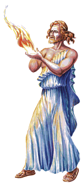 Согласно другой легенде, людей и животных боги создали из смеси огня и земли в земных недрах. Поскольку человек «был наг и не обут, без ложа и без оружия», Прометей похитил из мастерской Гефеста и Афины огонь, олицетворявший собой технический прогресс, и даровал его людям. Вместе с огнем Прометей украл «премудрое умение Гефеста и Афины… потому что без огня никто не мог бы им владеть или пользоваться». Эсхил утверждал, что «все искусства у людей от Прометея». Именно он наделил их разумом, научил возводить жилища, строить корабли, заниматься ремеслами, читать, писать и считать, а также приносить богам жертвы.