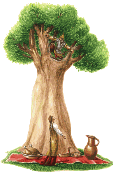 Марья, заметив на дереве Илью, пригласила его спуститься и поесть вместе с ней, пока она еще не убрала скатерть. Затем она рассказала, что муж ее имеет добрый нрав и никого не обижает, но у него есть мечта: он во что бы то ни стало хочет поднять землю.