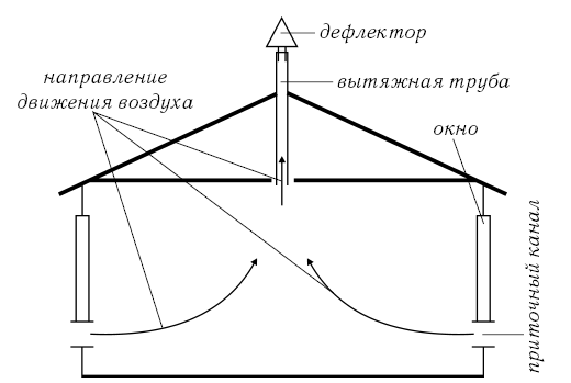 Под окнами сооружения необходимо разместить вытяжные трубы и приточные каналы (рис. 18), при этом вытяжных труб требуется меньше, чем приточных каналов, но площадь их сечения должна быть больше. Таким образом, общая площадь сечения приточных отверстий составляет примерно 70–80 % от вытяжных труб, что позволяет наружному воздуху равномерно поступать в помещение.