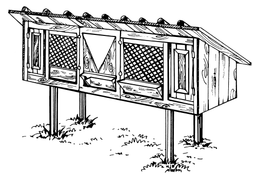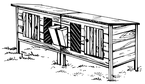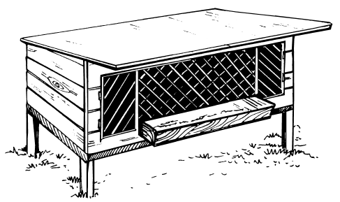 Научно-исследовательским институтом пушного звероводства и кролиководства (НИИПЗК) была разработана двухместная одноярусная клетка, подходящая для наружного содержания кроликов (рис. 23). Ее длина составляет 220–240 см, ширина — 65 см, высота передней стенки — 50–60 см, задней — 35 см. Односкатная крыша спереди снабжена выступом 20 см, а по бокам — 10 см.