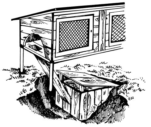 В приведенной выше конструкции искусственные норы расположены под землей, что помогает в зимнее время уберечь молодняк от переохлаждения, а в летнее — от перегрева. От родильного отделения в клетку ведет 2-метровая труба, подъем по которой стимулирует аппетит крольчат и благотворно влияет на их здоровье.